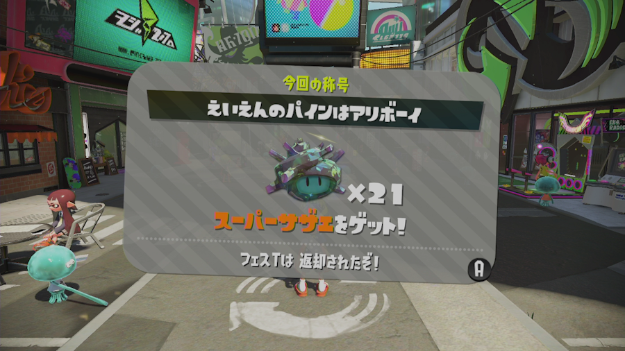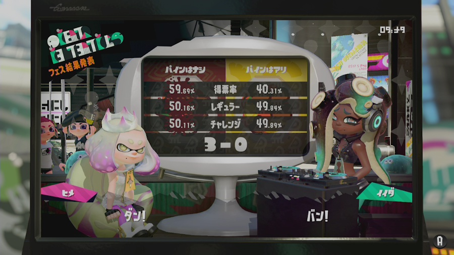スプラトゥーン酢豚フェスは、パインなし派の勝利でしたね。フェスパワーは前回と同じ終始わかばで2100台どまり。残念。自環境だけかもしれませんが、今回は10倍マッチが多く発生していました。あと同派チームの全イカが短射程でマッチングすることも多いように感じたでしょうか。![]()